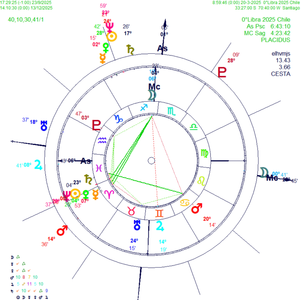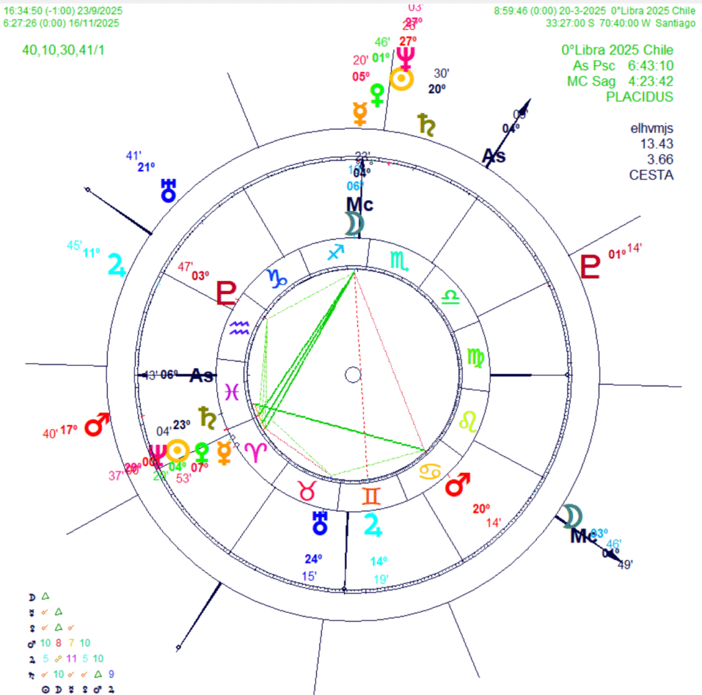 Consideremos por ejemplo la puerta del año del 0° Aries para Chile en el 2025. Como bien es sabido es un año electoral donde las elecciones estan pautadas para el 16 de noviembre en primera vuelta. El candidato ganador si no obtiene más del 40% de los votos pasaran los dos primeros a una segunda vuelta a realizarse el 9 de diciembre del 2005.